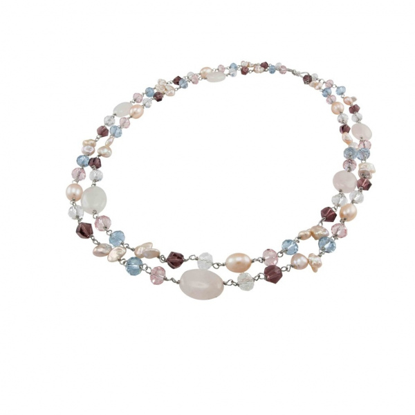 Ogrlica, sestavljena iz dveh nizov sladkovodnih biserov v pastelni barvi, s kroglicami ahata in stekla, prilagodljiva dolžina 120/60 cm.
